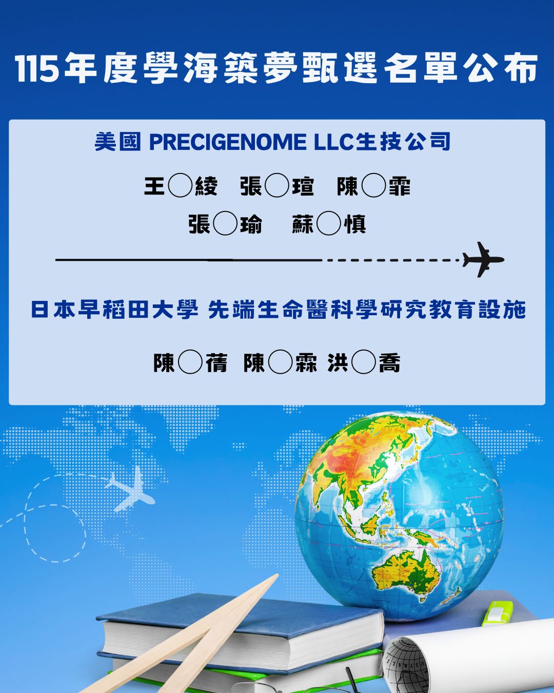 [2026/02/24] 【國際交流】115年度教育部「學海計畫」醫檢再生學系遴選名單公告